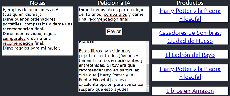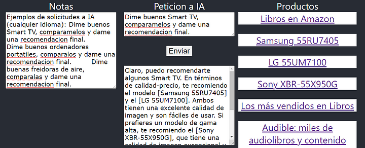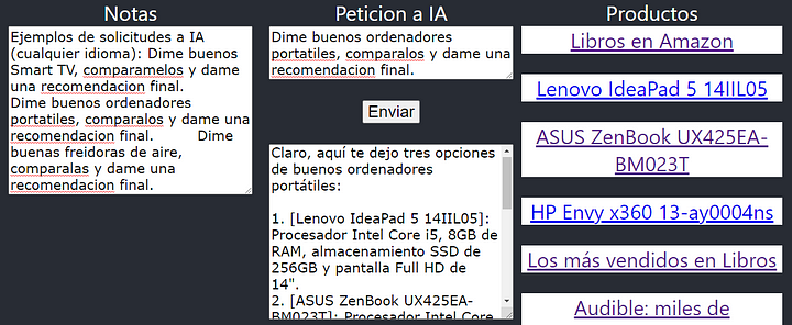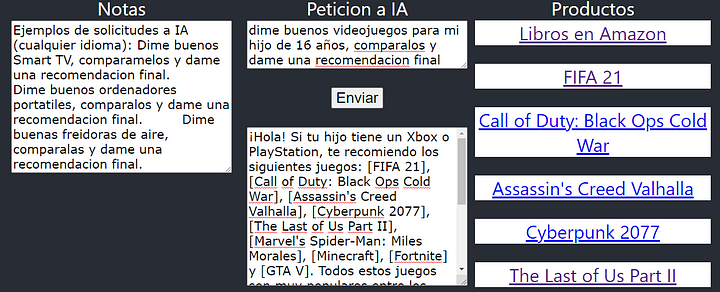 Ejemplo de una peticion en Store Assistant AI, con la respuesta obtenida usando gpt-3.5-turbo API y con los enlaces afiliados a Amazon de los productos recomendados